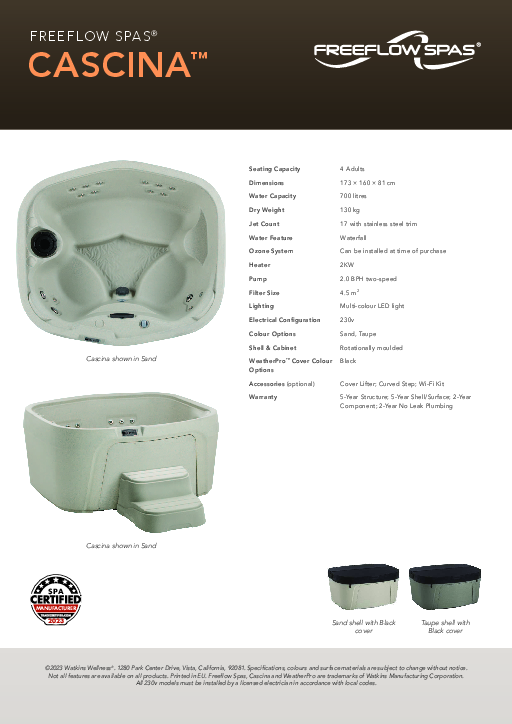 The Cascina spa was designed to bring you maximum comfort at a minimum price and offers a much deeper soaking experience than other spas of comparable size. It has a built-in cascading waterfall and is fully foamed to keep electricity costs low.