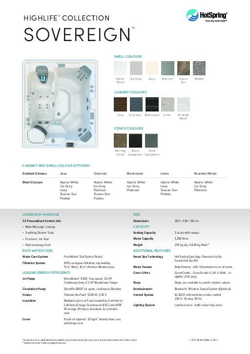 The spacious Sovereign features a more rectangular shape to fit in tighter spaces. It includes a lounge with our Moto-Massage® DX jet and two luxurious corner seats.