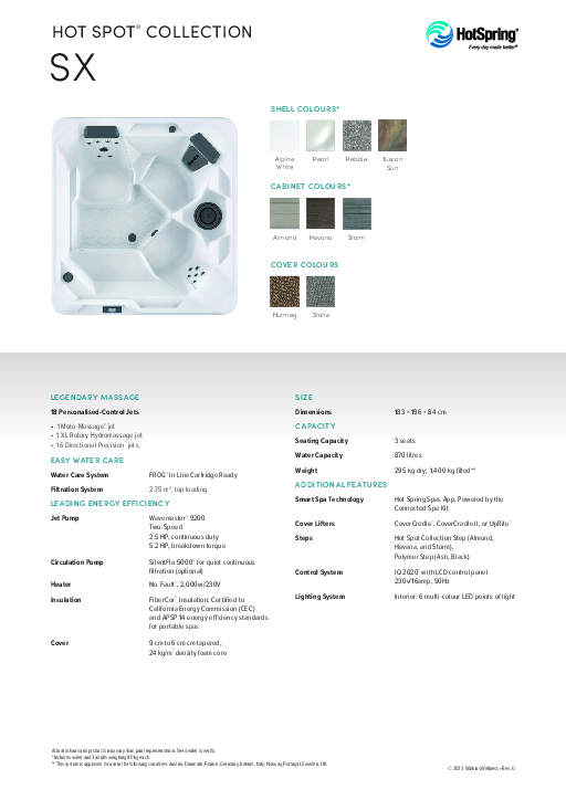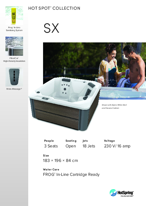The compact three-seat SX fits smaller spaces while giving you room to stretch out. The Moto-Massage® jet plus adjustable Precision™ jets deliver a unique massage.