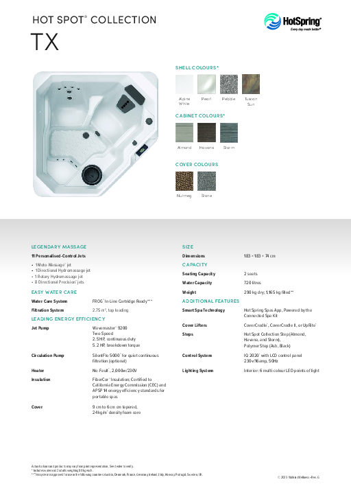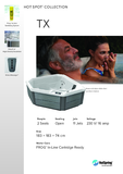With its unique shape, the two-seat TX fits in spaces other hot tubs don’t. Our Moto-Massage® jet and adjustable Precision™ jets recharge and invigorate you.