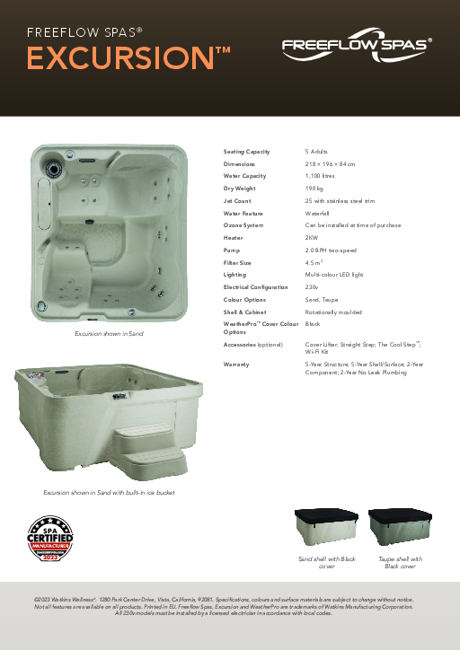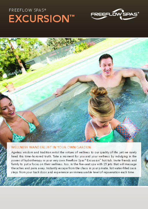 The 5-seat Excursion spa features a lounge for maximum comfort and a molded-in ice bucket making it the perfect spot for entertaining friends or spending time with family. Sit back and relax in the lounge seat as calf jets massage your legs, leaving you feeling rejuvenated.