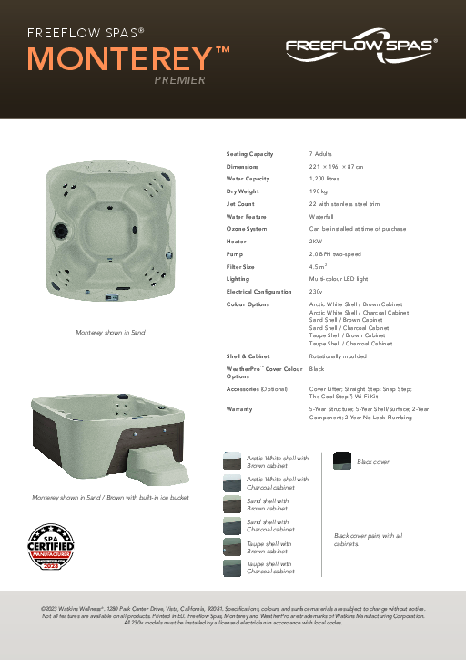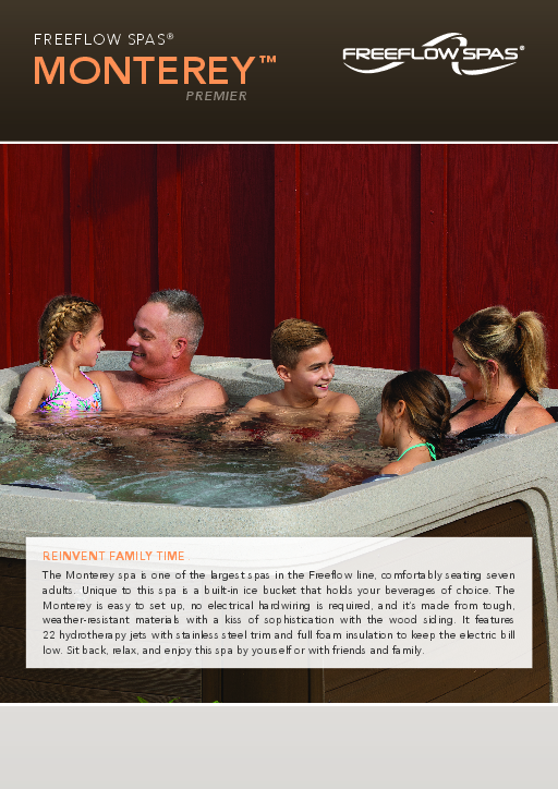 The Monterey spa is one of the largest spas in the Freeflow line, comfortably seating seven adults. Unique to this spa is a built-in ice bucket that holds your beverages of choice. The Monterey is easy to set up, no electrical hardwiring is required, and it’s made from tough, weather-resistant materials with a kiss of sophistication with the wood siding. It features 22 hydrotherapy jets with stainless steel trim and full foam insulation to keep the electric bill low. Sit back, relax, and enjoy this spa by yourself or with friends and family.