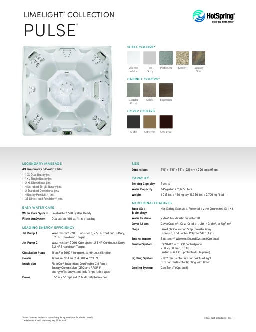 Limelight Collection spas feature an Energy Smart™ System to reduce energy consumption. You can have peace of mind knowing that your spa will be hot and ready when you are, while keeping energy costs low.